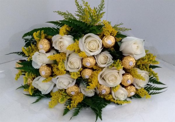 Bouquet 12 rosas brancas + 12 Bombons Ferrero Rocher.