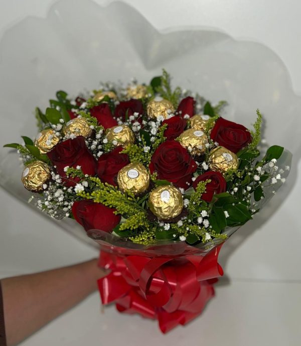 Bouquet 12 rosas vermelhas + 12 Bombons Ferrero Rocher.